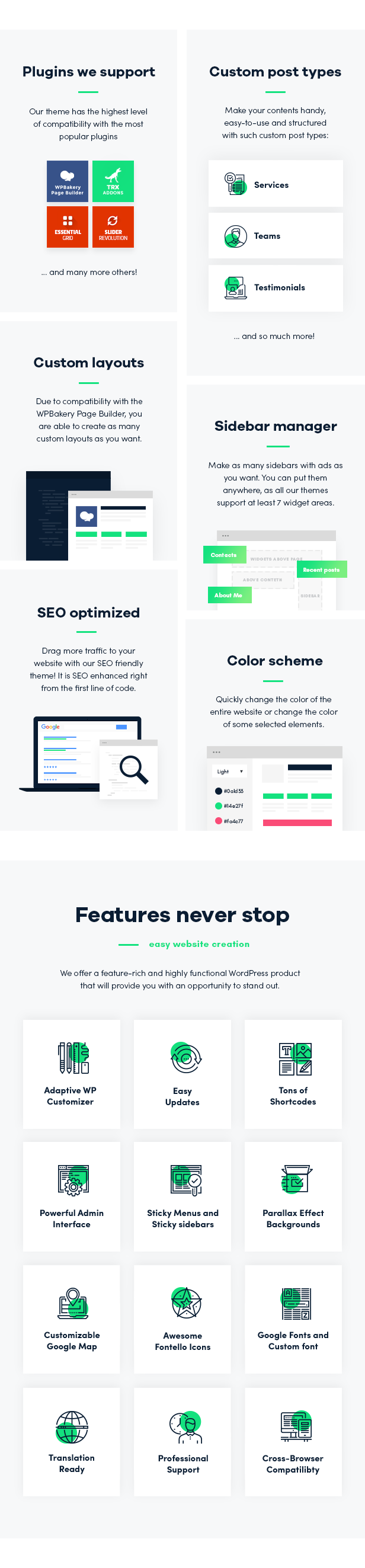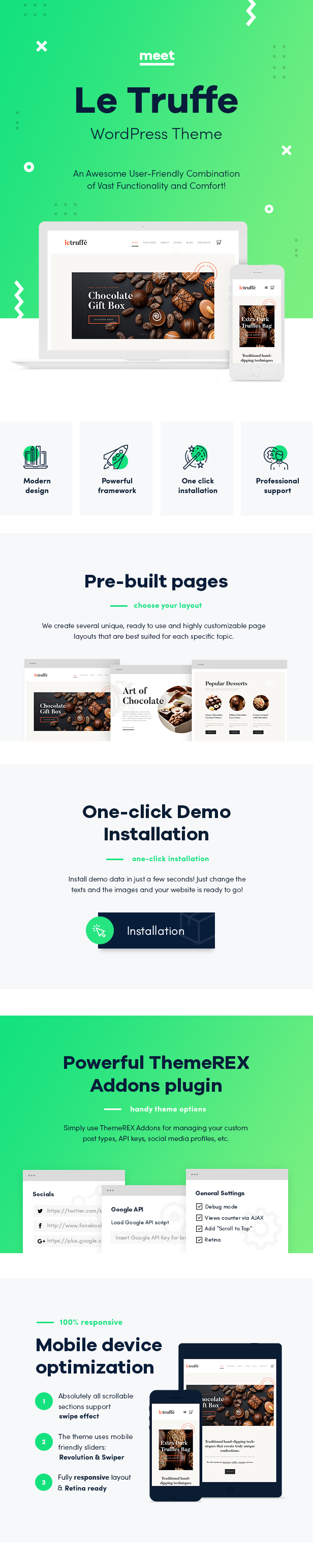Le Truffe is a modern fresh and functional WordPress theme designed for contemporary chocolate company, sweet shop, chocolate boutique, bakery firm, hand-made sweets manufacturer, food or beverage agency, catering company or other topic-related businesses.
