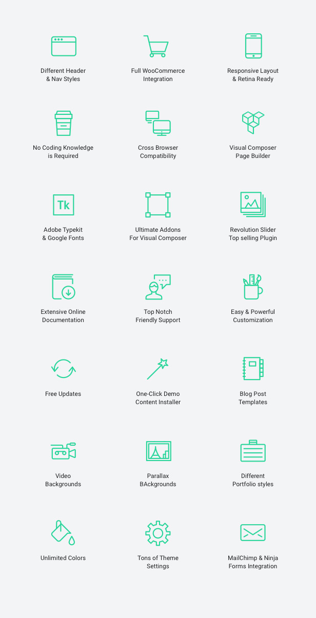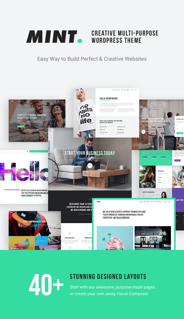Mint is a multi-purpose, clean, creative, fully responsive and powerful WordPress Theme. Our theme has included multiple header layouts, Revolution Slider plugin, drag & drop visual page builder (Visual Composer), powerful theme options panel, video backgrounds, parallax, many elements, 700+ Google Font and more. Great modern design and Powerful features makes Trendy irresistible. All our theme can be modified with the panel, a lot of page layouts, headers, layout options, blog options are avaliable, all the fields have useful hints to help you. Mint is the best choice for you to create a business, creative agency or personal portfolio, photography or a blogging website.